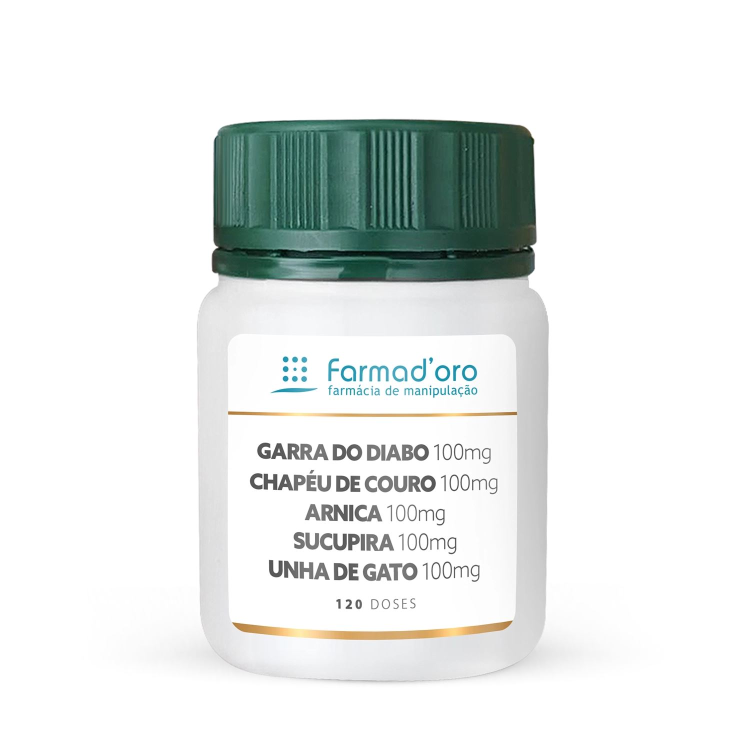 Fórmula manipulada com Garra do diabo 100mg; Chapéu de couro 100mg; Arnica 100mg; Sucupira 100mg; Unha de gato 100mg.